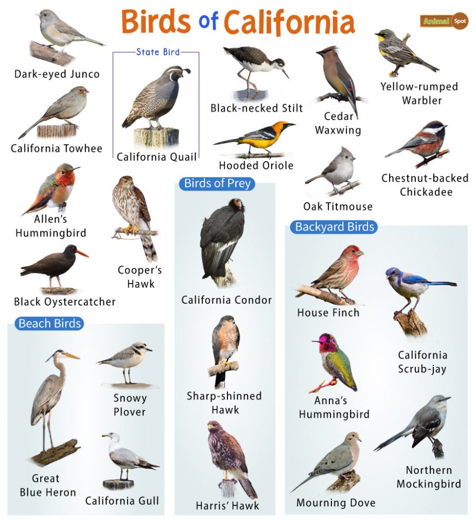 California is a vast state with diverse ecosystems and different bird species distributed across its regions. Here is a brief overview of the different regions and the common bird species found in each: